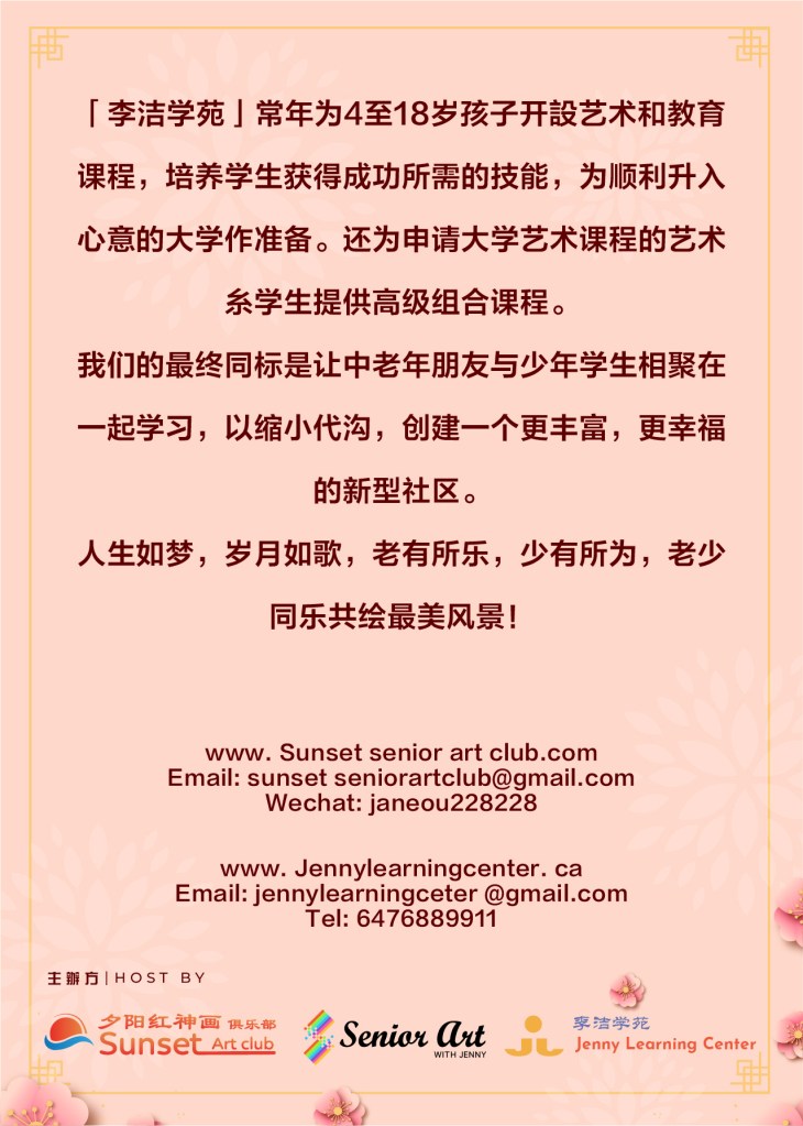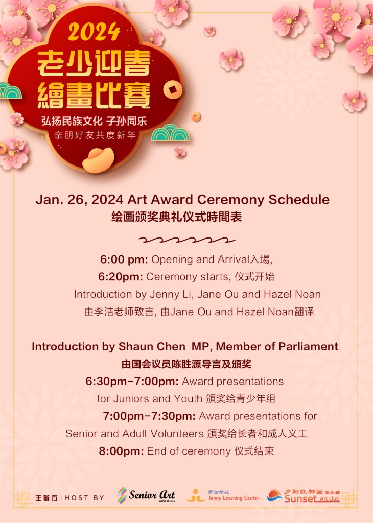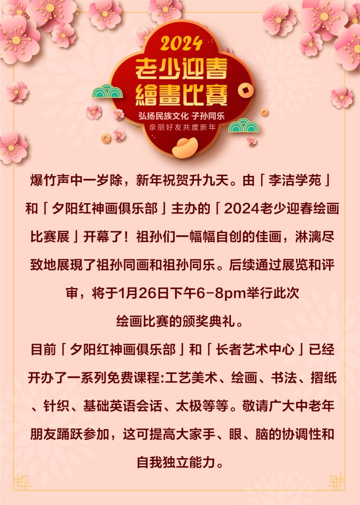 爆竹声中一岁除,新年祝贺升九天。由「李洁学苑」和「夕阳红神画俱乐部」主办的「2024老少迎春绘画比赛展」开幕了!祖孙们一幅幅自创的佳画,淋漓尽致地展現了祖孙同画和祖孙同乐。后续通过展览和评审,将于1月26日举行此次绘画比赛的颁奖典礼。
