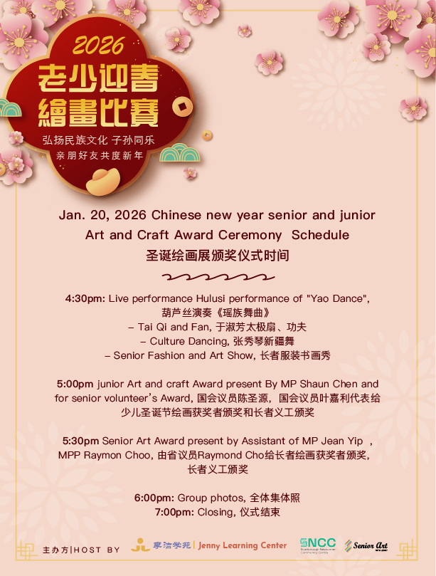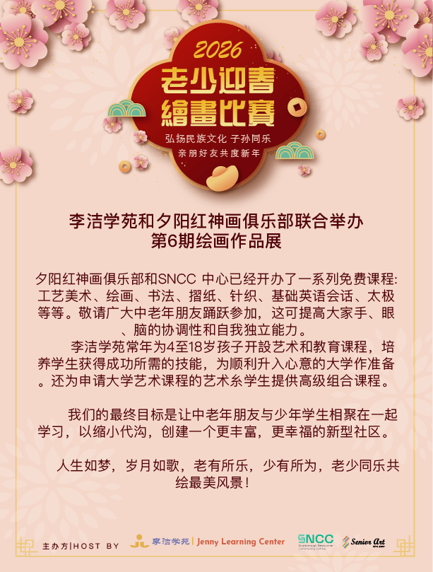 爆竹声中一岁除,新年祝贺升九天。由「李洁学苑」和「夕阳红神画俱乐部」主办的「2026老少迎春绘画比赛展」开幕了!祖孙们一幅幅自创的佳画,淋漓尽致地展現了祖孙同画和祖孙同乐。后续通过展览和评审,将于1月26日举行此次绘画比赛的颁奖典礼。